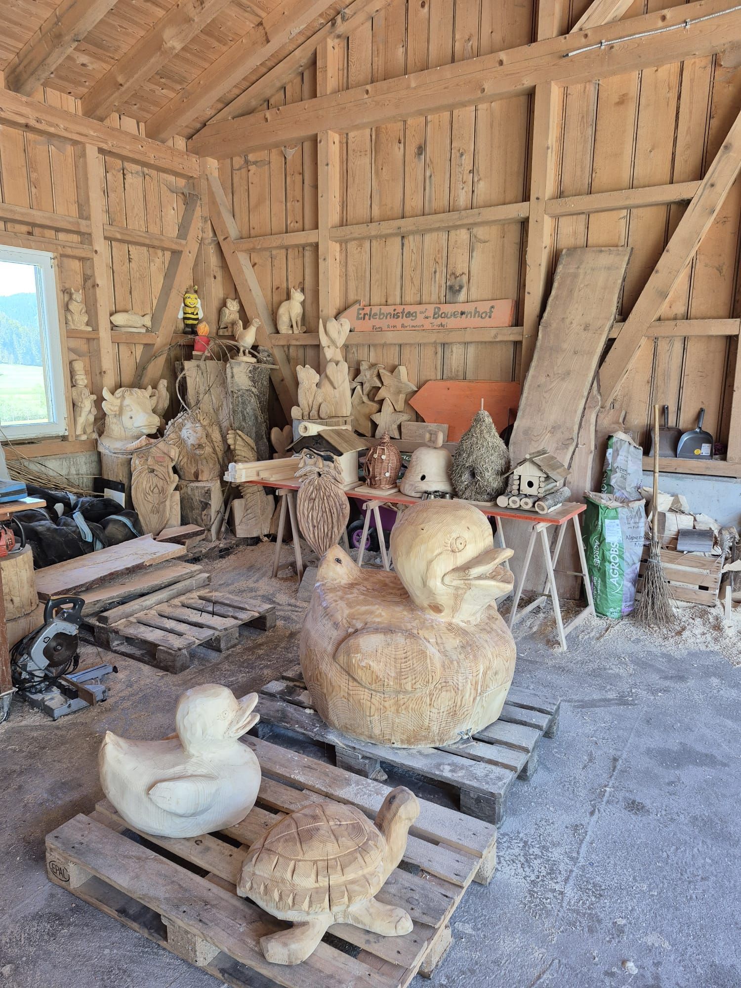 Luzia hat mit der Motorsäge vier schöne Holzfiguren geschnitzt. Zusammen ergeben sie ein hübsches Jodlerchörli - Alphorn, Bass, Schwyzerörgeli und Jodlerin.