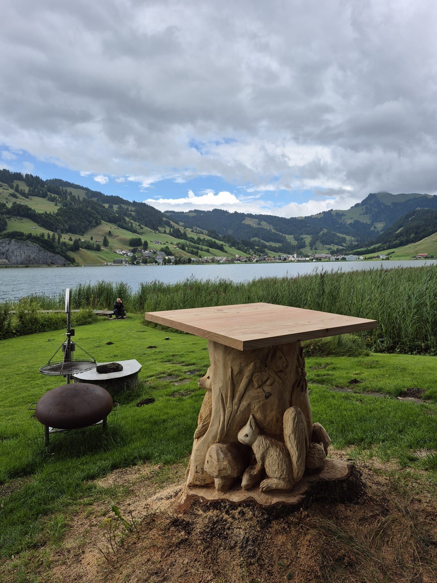 Das neuste Schnitzwerk von Luzia zeigt eine Gallowaykuh mit Kalb und ist beim Hofladen im Waldweg 3 auf der Strecke von Einsiedeln nach Egg/Teufelsbrücke zu sehen. Hier ein Bild vom Anfang (links) sowie das schöne Endergebnis (mitte und rechts).