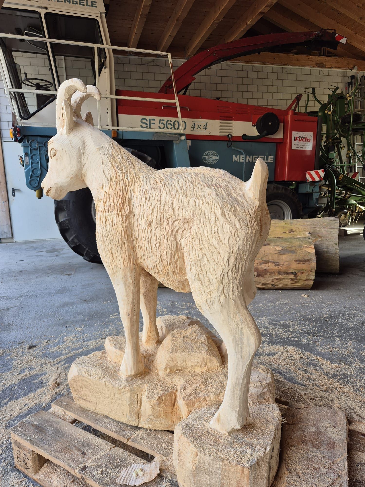 Kürzlich hat Luzia an einem bestehenden Baumstrunk in Unteriberg ihr neustes Schnitzwerk beendet: eine Gemse. Der Baum steht am Spazier- und Wanderweg entlang dem Nidlaubach.
